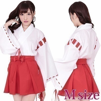 願い事があるなら、まずはお祈りしてね!白着物に赤のパイピングリボンが印象的な、巫女さんのコスチューム。袴風にアレンジされたミニスカートが可愛いらしい巫女さん衣装で、あなたも夢のなかの巫女ちゃまに大変身!