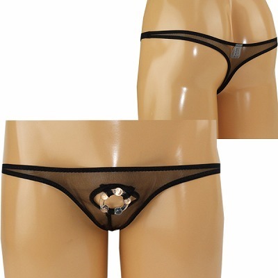 逞しいボディをアピールするならセクシーな小悪魔Tバックで決まり!極薄生地のフロント部分を丸く切り抜き、締め付け刺激するイボ付きリングを取り付けたメンズ用の日本製オープンランジェリー。透ける生地から見える健康的な肌に思わずドキッ!魅惑のボディで小悪魔に誘惑するメンズ用穴あきTバックです。